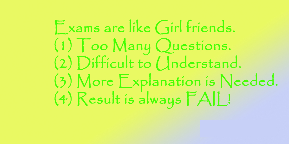 Exam is the most dangerous things in student life. To make this moment funny here has some funny exam status for you entertainment. You can share this easily with your friends. Exams are like Girl friends. (1) Too Many Questions. (2) Difficult to Understand. (3) More Explanation is Needed. (4) Result is always FAIL! DearContinue reading “Some Exam Status”